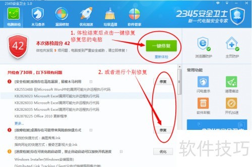3、 安全体检后,发现电脑存在未安装的安全补丁,还有软件卸载后无效的桌面快捷方式。此时只需单击一键修复,就能自动下载补丁并删除无效快捷方式。