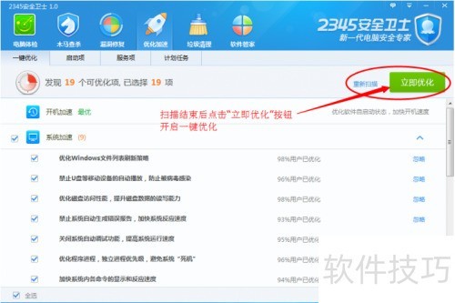 5、 电脑优化时,扫描开机项,有些软件无需开机启动,扫描后会告知可优化项,点击立即优化即可。