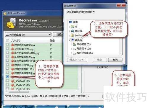 14、 弹出浏览文件夹窗口,选择恢复文件的保存路径后点击确定。Recuva推荐将恢复的文件存储在其他磁盘驱动器中,这样能提高成功恢复的概率。