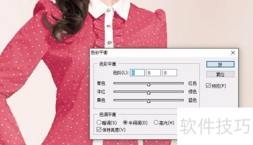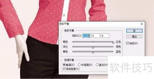 3、 选择要调整的衣服部分,这里借助图层遮罩工具,再用毛笔选择重点区域,将衣服完整从背景中复制出来,接着调整色彩平衡,最终得到红色衣服的效果。