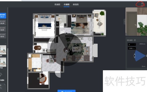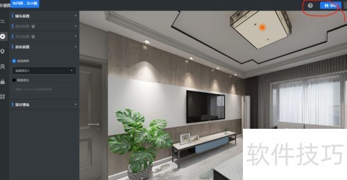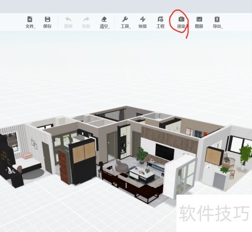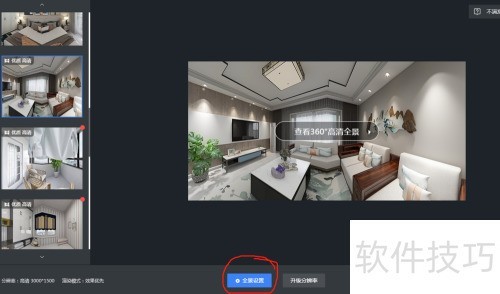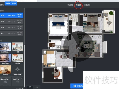 1、 进入3D界面,查看方案是否完整,点击渲染选项(上方)进入渲染界面,选取全景图渲染模式。