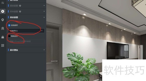 3、 在全景设置界面,点左侧第二个按钮来选择要更改的音乐。音乐分系统库和网络音乐,若系统库音乐无法满足需求,就选网络音乐找喜欢的,之后点击右上角的保存按钮。