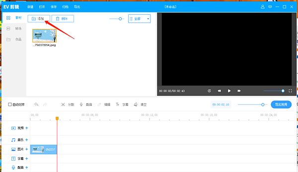 1、启动EV剪辑软件,在左侧上方有一个“添加”的按钮,点击添加我们所需的封面图片。