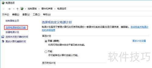 2、 二、于电源选项窗口,点击左侧窗格选择电源按钮的功能。