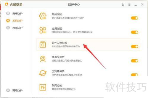 、 进入系统防护界面,开启软件安装拦截功能,点击即可激活。