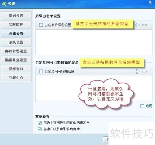 21、 除了实时防护,还支持杀毒设置。安全狗杀毒允许用户自定义后缀白名单,不喜欢扫描特定文件时,只需简单设置即可跳过。