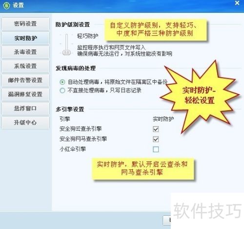 13、 中度防护:监控程序执行与写入、网页文件写入,阻止病毒入侵和运行,对系统影响较小。