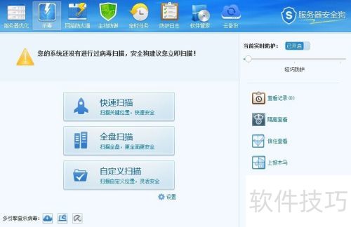 1、 启动服务器安全狗,直接点击杀毒按钮,无需安装即可进入。界面提供三种扫描模式,按需选择一种进行病毒检测。