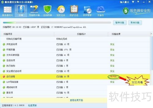 4、 在杀毒界面选择扫描方式开始查毒。启动后会弹出扫描进度窗口,显示当前扫描的文件、整体进度和发现问题的文件。用户可在此窗口暂停或取消扫描操作。