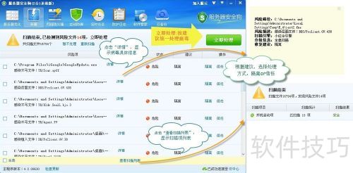 5、 扫描完成后,界面将显示总文件数与风险文件数。若有风险,会列出具体路径、木马文件、扫描引擎及分组信息,并提供修复建议。用户可根据实际情况选择隔离或信任处理。