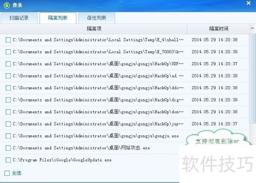 6、 例如,可选择要处理的风险项,点击立即处理按钮。如果文件被感染,系统将执行隔离操作,随后可在隔离列表中查看处理详情。需要注意的是,隔离列表中的文件能删除或恢复,但删除后无法还原,请务必谨慎操作。此外,信任列表中的文件或目录被视为白名单,不再视为病毒,用户也可根据需要添加或移除信任项。