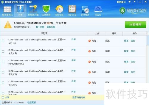 服务器存储着大量重要文件,若遭受病毒入侵导致文件损坏,将会造成严重损失。那么,当服务器中毒时,该如何处理这些病毒?服务器安全狗V4.2(2合1杀毒版)是一款专业的杀毒与安全防护软件,兼容多种主流服务器软件,同时集成小红伞、安全狗网马查杀和安全狗云查杀三大引擎,能够有效检测并清除服务器中的病毒,保障数据安全。