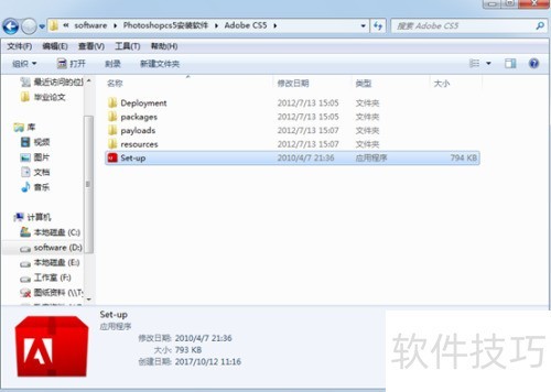 3、 二、解压压缩包后关掉网络连接,步骤为:找到PhotoShopCS5安装软件中的Adobe CS5文件夹,点击set - up。