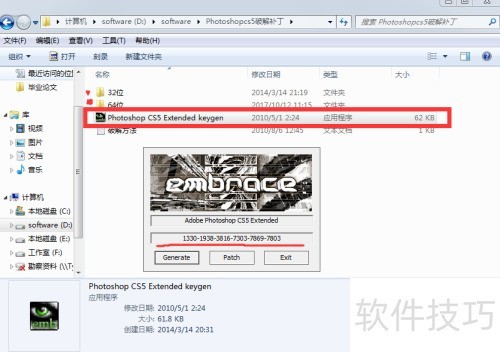 7、 五、打开已安装的PS软件,会提示输入序列码。打开下载的安装包,点击Photoshop CS5破解补丁生成序列码并复制。
