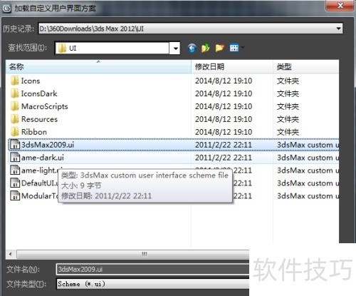 6、 打开UI文件夹,找到需加载替换的3dsmax2009.ui模板,双击就能把页面替换成2009版的页面。