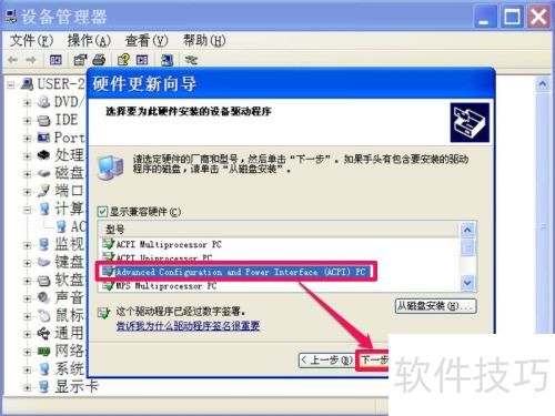 8、 进入新窗口后,在显示兼容硬件列表里,找到Advaanced Configuration and Power Inerface(ACPI)PC选项,然后点击下一步继续操作。