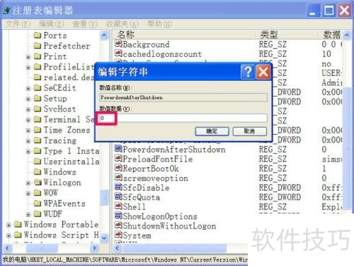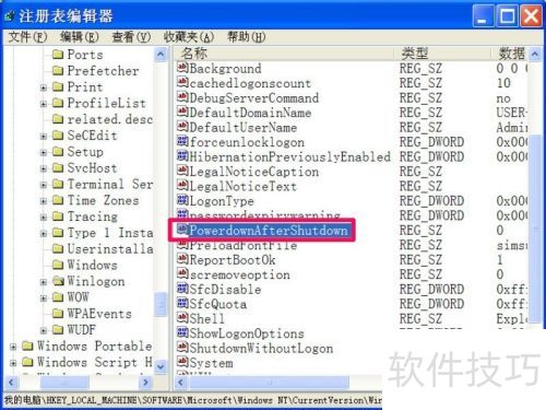 15、 接着,在Winlogon右侧窗口中找到PowerdownAfterShutdown项,双击打开修改窗口。