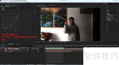2、 把素材导入时间线面板,接着要让图中的大头波特打响指后出现舞台灯光效果。