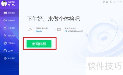 2、 打开腾讯电脑管家,点击全面体检选项。