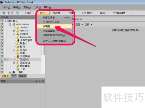 1、 先确认已安装ACDSee Pro 4软件并打开它,打开后于左上角点击导入/从硬盘来从硬盘导入图片,随后选取图片所在文件夹,再点击确定即可。