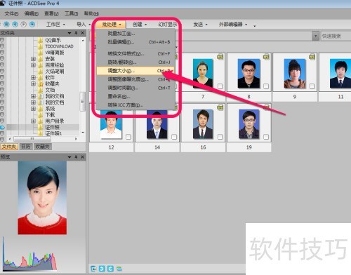 3、 接着用鼠标全选图片,点击左上角批处理中的调整大小命令,从而调整图片大小。