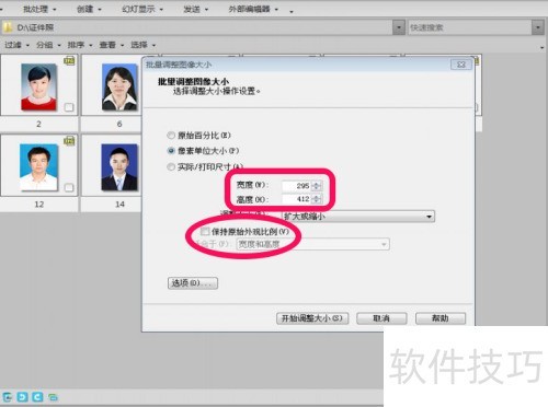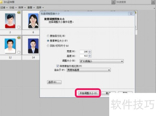 4、 在批量调整图片大小窗口,默认选项为像素单位大小,自行输入需设置的宽高,且取消保持原始外观比例选项。