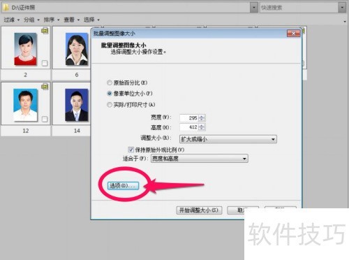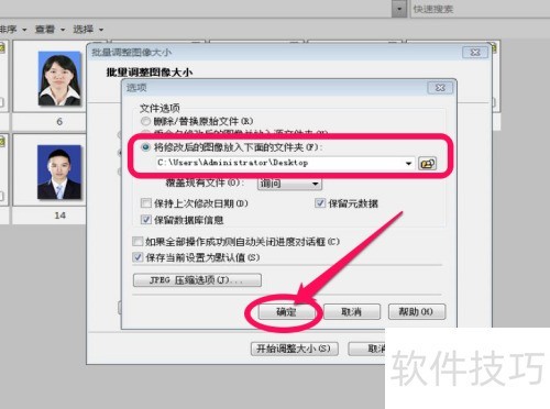 5、 这时,我们再次点击批量调整图片大小窗口左下角的选项按钮,于选项窗口里选择处理后图片的存放位置,点击确定,返回批量调整图片大小窗口。