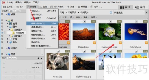 2、 在acdsee中定位目标图片并选中,批量处理时全选,随后于左上角批处理选项里选择格式转换。