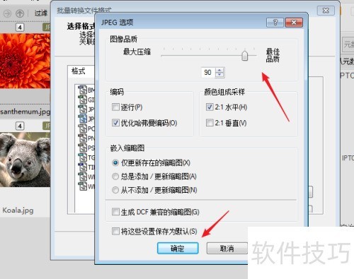 4、 小编随意选择acdsee图片格式转换中的jpeg格式,进入acdsee的格式设置后,即可调整图像品质,数值越小压缩率越高。下方还提供编码、颜色组成采样和嵌入缩略图等功能选项。