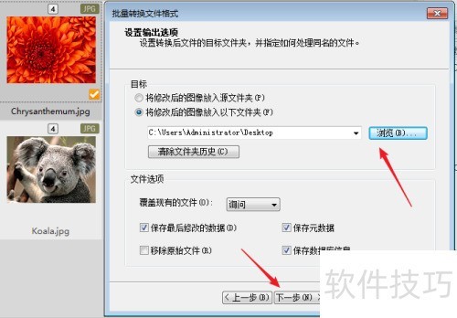6、 在acdsee看图软件的批量格式转换输出窗口中,选择修改图片的保存位置,可选原图所在位置或自定义,确认后点击下一步操作。
