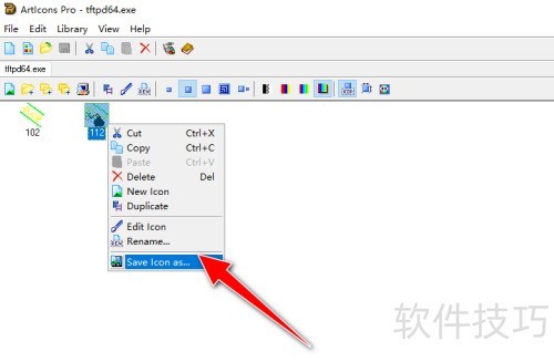 5、 操作完成后,能将所选exe可执行文件的图标资源获取到操作面板窗口。用鼠标左键选中要导出的图标,然后单击鼠标右键,在弹出菜单里选择Save Icon as...选项。