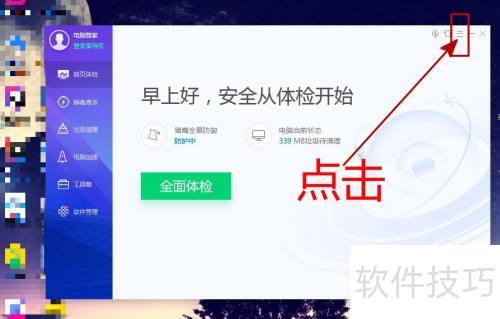 2、 打开腾讯电脑管家首页,点击右上角的三条横线图标。