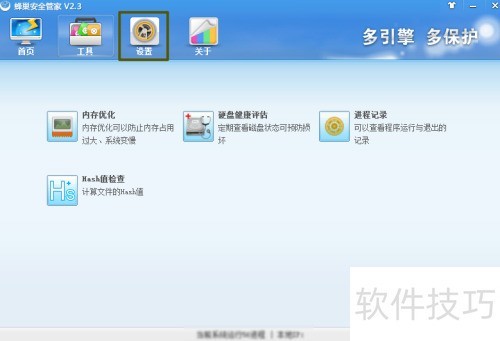 1、 打开电脑已安装的蜂巢安全管家,再点击其中的设置。