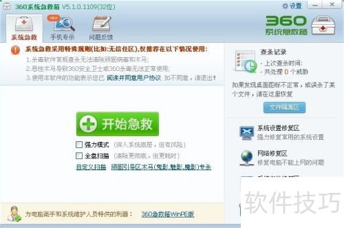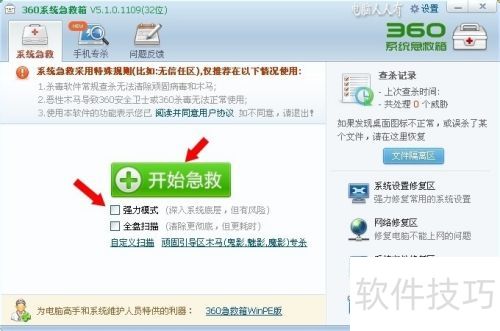 10、 这里有强力模式与全盘扫描选项,看清此页说明非常重要,别盲目点击开始急救。这是把双刃剑,能清除病毒、木马等不良程序,也可能使操作系统瘫痪,必须谨慎对待。
