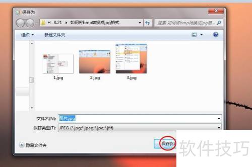 4、 第三步:于保存为对话框里选择图片存储位置,点击保存按钮,即可将图片格式从bmp转换为jpg。