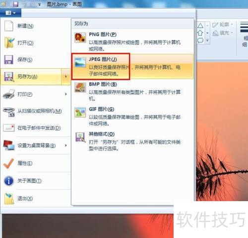 3、 第二步:打开画图界面,点击左上角的下拉菜单,选择另存为,然后保存为JPEG图片格式。