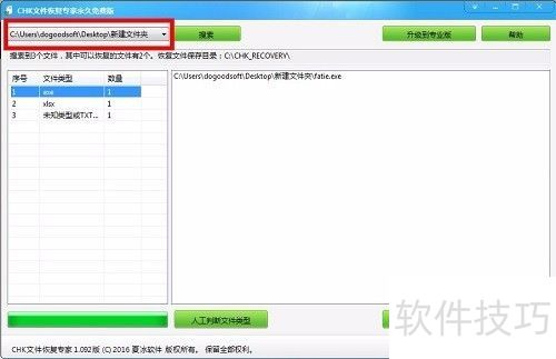 2、 在CHK文件恢复专家的左侧区域,会显示扫描到的各种文件类型,包括可识别的如exe、xlsx等(不包含未知类型),这些文件是可恢复的。首先,在左侧列表中选择目标文件类型,此时软件右侧的文件列表框将展示该类型的所有文件。接着,依次点击所需文件,最后点击按钮即可。