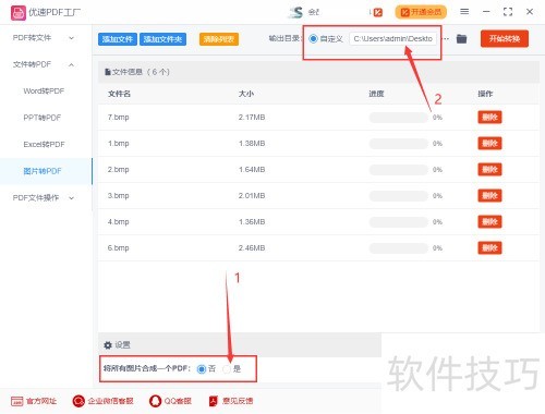 2、 步骤2,添加完bmp图片后开始设置。首先要确定是否将所有图片合成一个pdf,按自身需求选择(案例选否),接着在上面设置数目目录,以保存转换后的pdf文件。