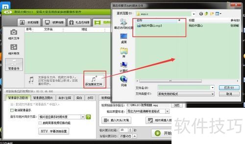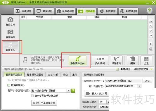 3、 点击视频相册,导入所需图片。接着点击背景音乐,选择添加媒体文件。