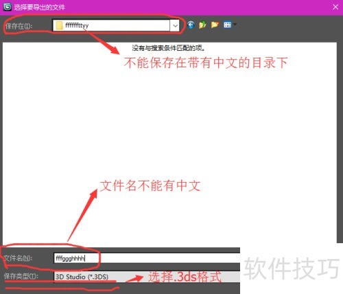 4、 点击导出,将文件类型设为.3ds(注意:文件不可保存在含中文的目录下,文件名不能有中文)