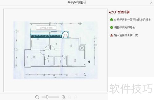 13、 上传现有户型图(至少标注一个墙体尺寸),把标尺移至已知长度的墙面上进行校准。