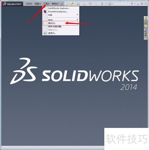 1、 打开Solidworks2014软件,在其目录里点工具中的插件按钮,就像图中展示的那样。