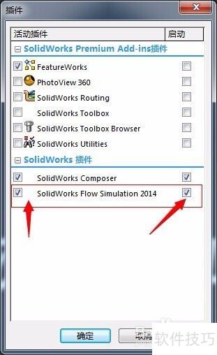 2、 点击插件按钮后会弹出插件对话框,勾选SolidWorks Flow Simulation 2014前后的两个框,再点击确定,加载完成就可以了,具体可参照图中所示内容。