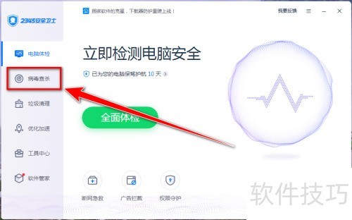 1、 打开2345安全卫士,在左侧工具栏点击病毒查杀。