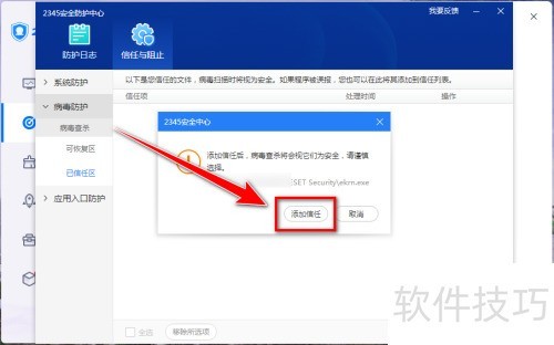 5、 在提示框里点击添加信任按钮,就能把该文件添加进信任列表。