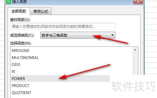 进入插入函数界面,选择数学与三角函数类别,再选中Power函数即可。