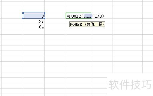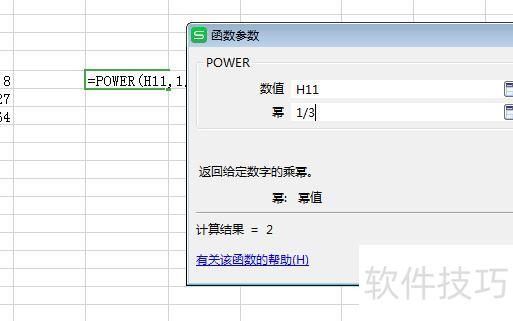 在POWER函数中,选择目标数值单元格,幂值输入1/3,确认即可完成立方根运算。