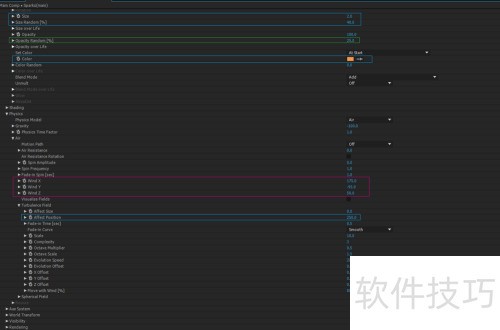 6、 创建主合成,将分形噪波和文字的合成拖入。新建一个固态层并添加Particular效果。设置发射类型为Layer,选择分形噪波和文字合成,尽量增加每秒粒子数。将速度(Velocity)设为7,重力设为-100,混合模式(Blend Mode)选Add。调整Air Winds参数,并将粒子颜色改为火焰色系。最后修改Turbulence Field的相关数值以优化效果。