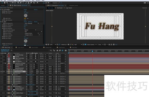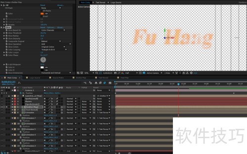 14、 将分形噪波与文字合成纳入,开启3D模式,添加Fill效果,透明度由100渐变至0,同时叠加Glow效果,并置于文字层 Luma Matte分形噪波层之上。