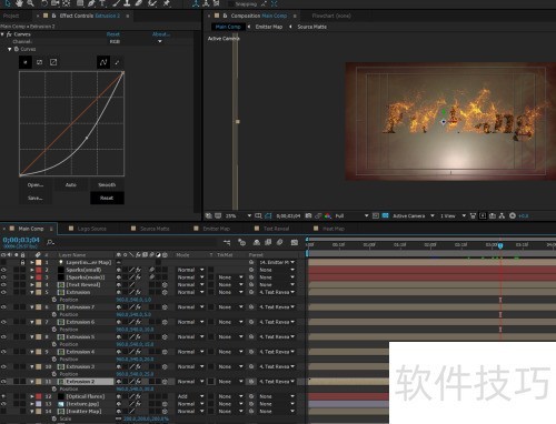 17、 将文字层 Luma Matte 分形噪波层模式设为叠加。对文字层 Luma Invert Matte 分形噪波层添加曲线与辉光效果,调整其视觉表现,使层次融合更自然,突出发光质感,增强整体画面的立体感与氛围感。